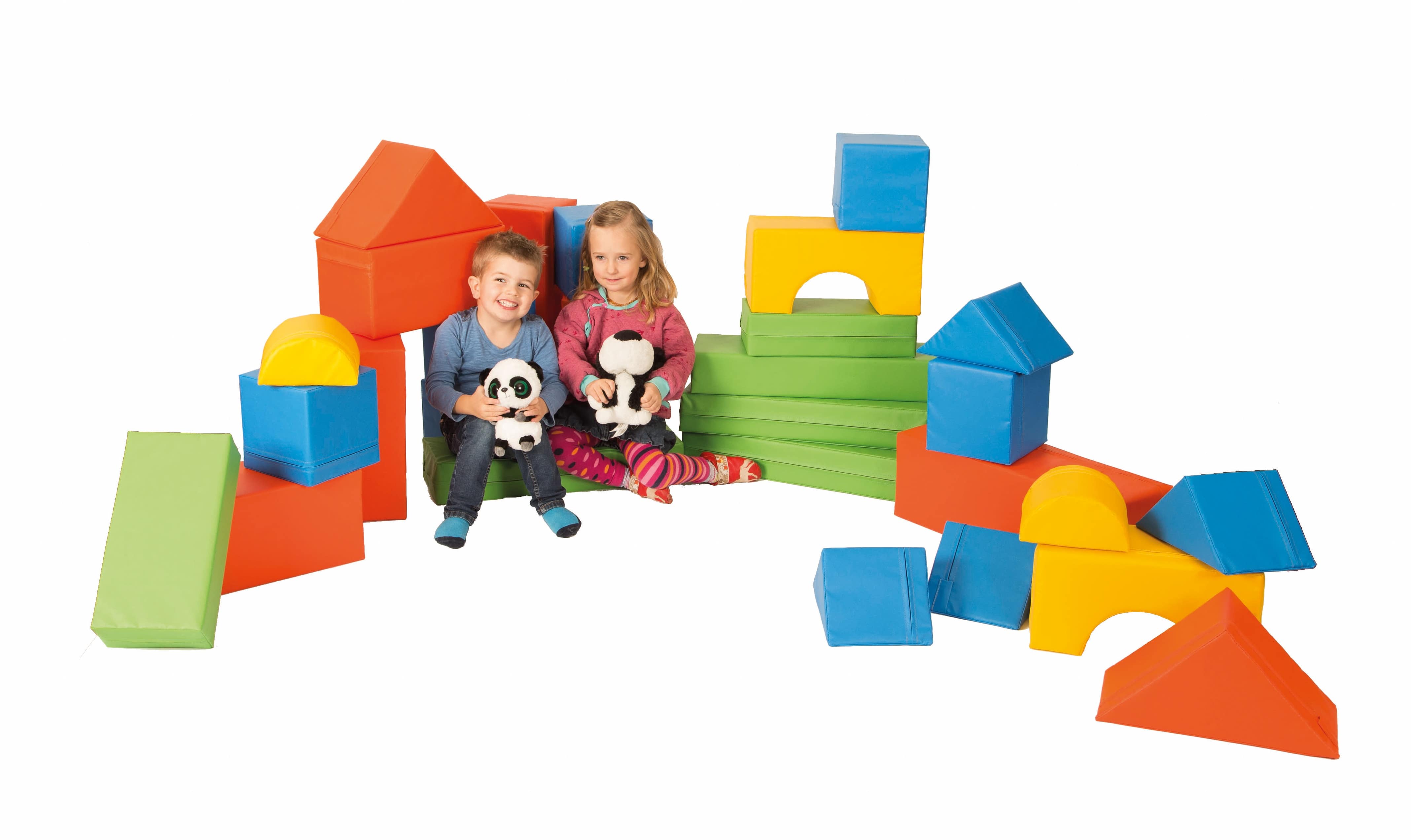 Bei dem Bezug der Bausteine handelt es sich um farbigen Leichtplanenstoff. Dieser ist schwer entflammbar, phthalatfrei, urin- und schweißbeständig. Der Schaumstoff besteht aus Ökö-Tex zertifiziertem PU- und Verbundschaum.