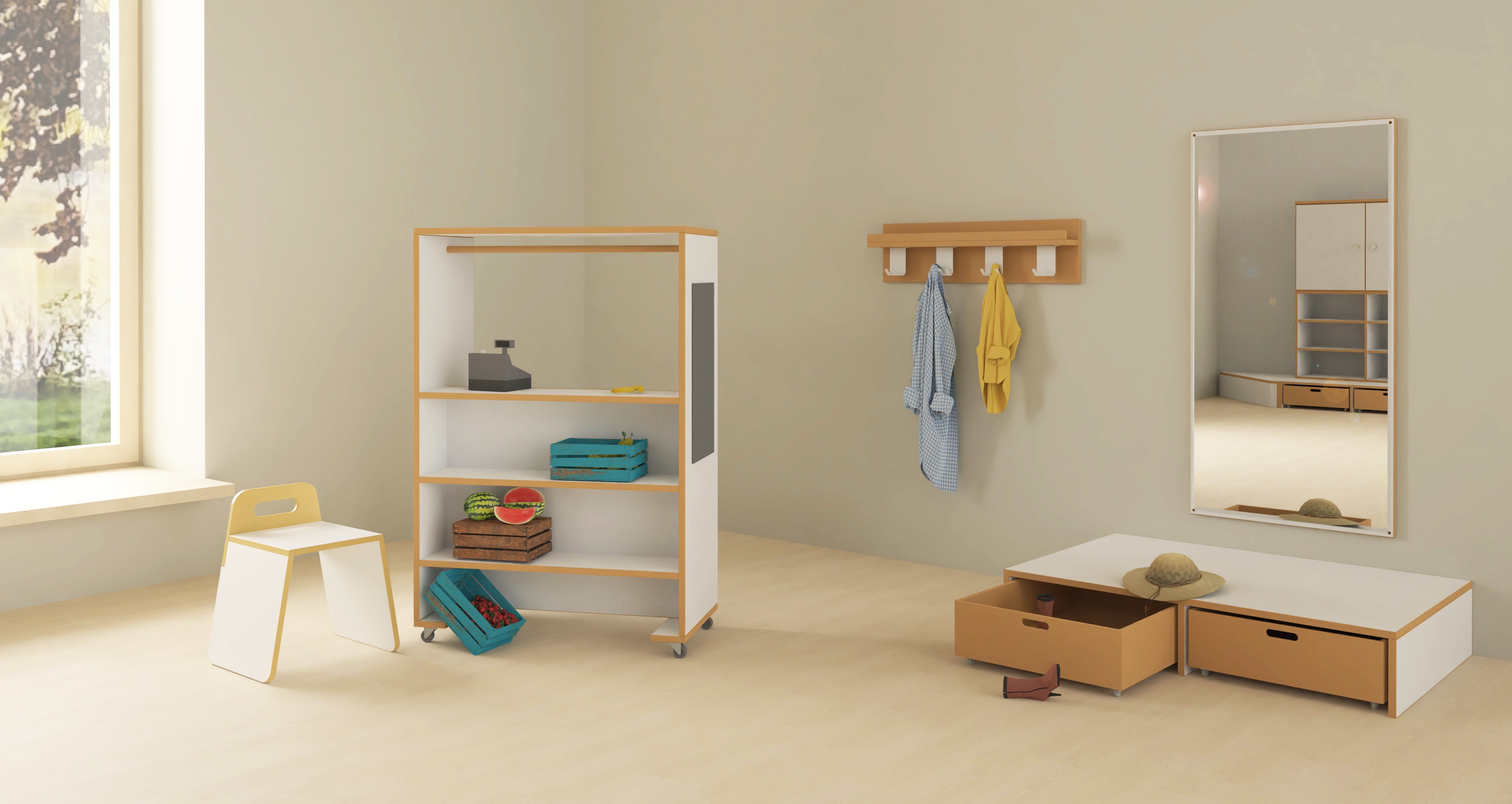 Diese Möbelkombination mit Minibühne und vielseitigem Theater-Modul bietet zahlreiche Möglichkeiten für Rollenspiele und gemeinsame Auftritte. Die neutrale Gestaltung der Bühne samt Stapelhocker lässt Raum für kreative Ideen wie einen Kaufladen, eine Post oder ein Puppentheater und fördert so die Fantasie der Kinder. Das kleine Podest dient als zusätzliche Spielfläche und in den integrierten Rollkisten ist reichlich Stauraum für Kostüme vorhanden. Eine Hakenleiste und ein großer Spiegel vervollständigen den Verkleidungsbereich. Durch diese flexiblen Bestandteile entstehen im Gruppenraum immer wieder neue Spielwelten, die das soziale Miteinander und das Einnehmen verschiedener Rollen unterstützen.