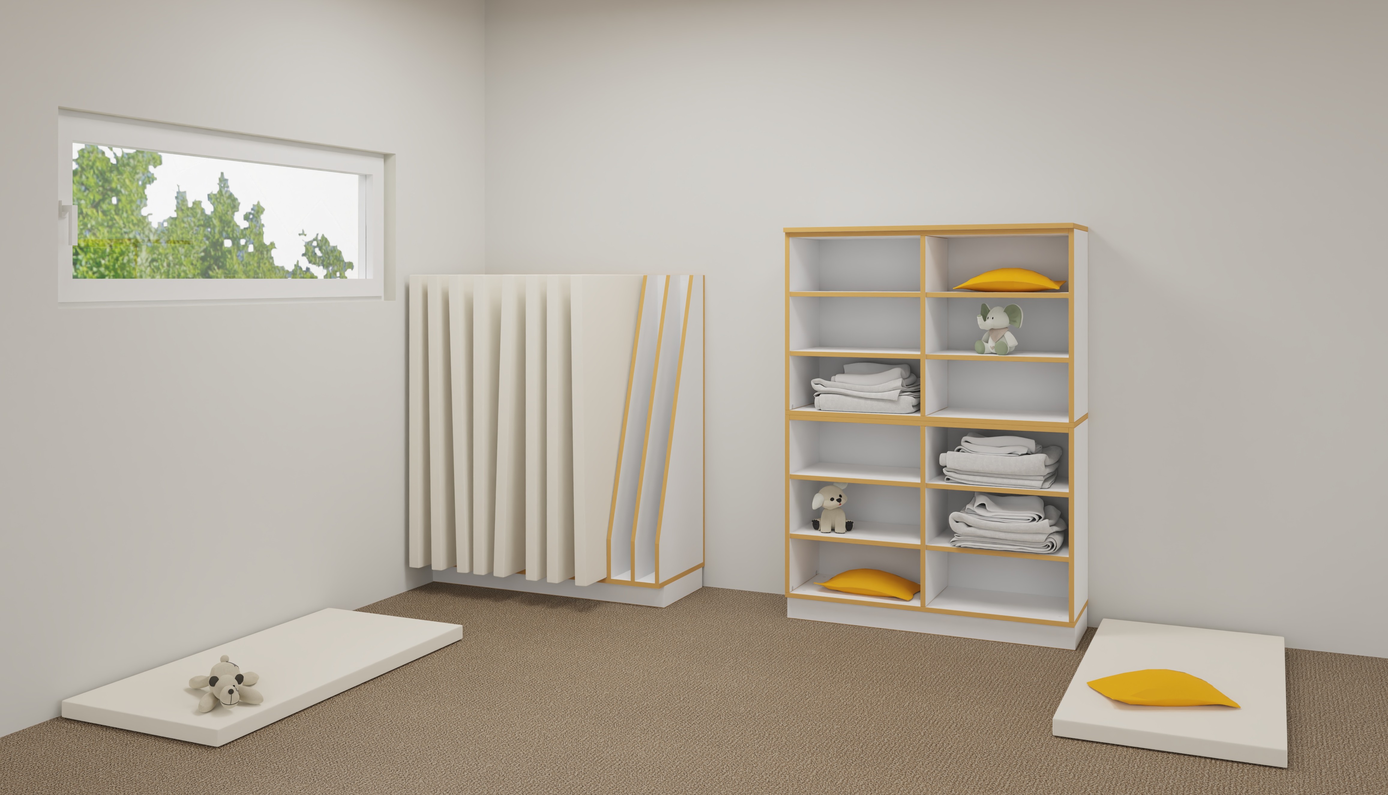 Diese Kindermöbel sind die ideale Lösung für den Schlafraum in der Kita, da sie eine flexible Nutzung des Raums für unterschiedliche Bedürfnisse ermöglichen. Das Set bietet Schlafplätze für bis zu zehn Kinder auf bequemen Matratzen. Diese können bei Nichtgebrauch einfach hochkant im passenden Matratzenregal verstaut werden. So wird im Handumdrehen wieder Bodenfläche für Spiel und Bewegung frei, während zur Mittagszeit schnell eine gemütliche Ruheoase entsteht.
