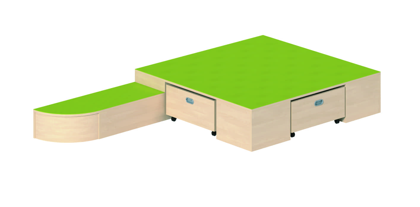 Alle in diesem Set erhältlichen Podeste werden aus 19 mm dicker, melaminharzbeschichteter Spanplatte hergestellt. Zur Vermeidung von zusätzlicher Lautstärke durch wildes Toben von den kleinen Wirbelwinden wurde geräuschdämmender und kratzfester Linoleumbelag auf der Oberseite verwendet. Das Linoleum ist pflegeleicht und kann sowohl trocken als auch feucht abgewischt und desinfiziert werden. Alle Podestelemente sind in verschiedenen Höhen und Dekoren frei wählbar.