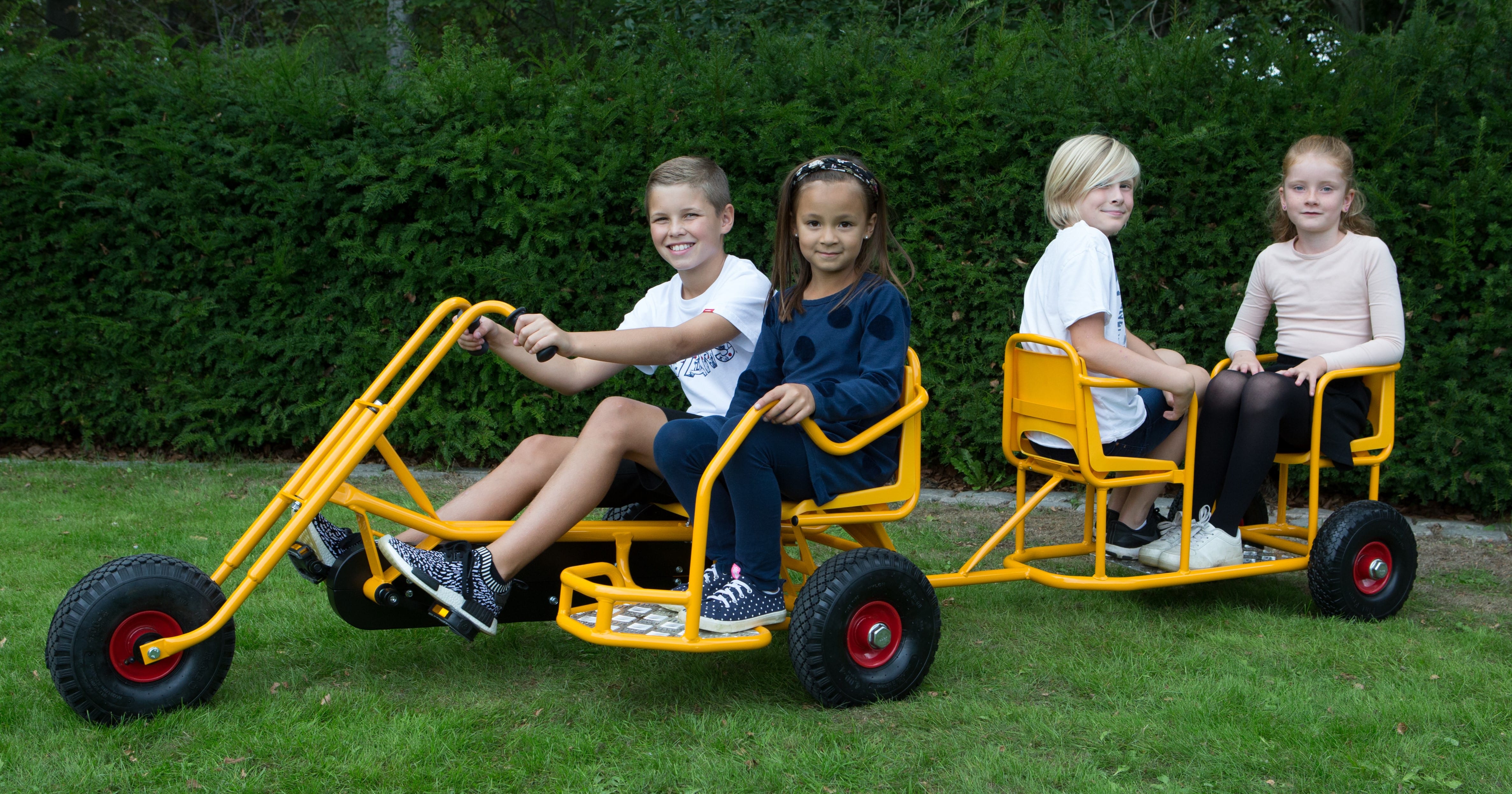 MOON-CAR Trolley - für Kinder ab 5 Jahren. Trolley eignet sich für den Transport von zwei Kindern. Die Anhängerkupplung und die Standard MOON-CAR Kupplungsvorrichtung bieten Ihnen die Möglichkeit, einen langen Zug zu machen.