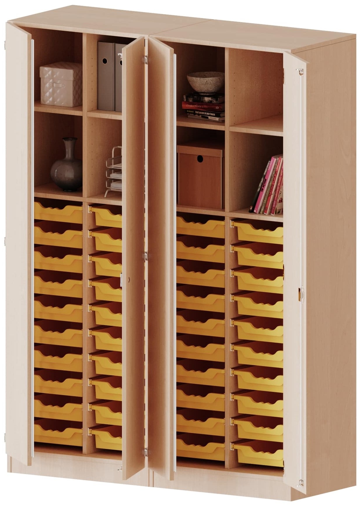 Der Schrank ist mittels Zylinderschloss verschließbar. Es werden zwei Schlüssel je Schloss mitgeliefert. Optional können Sie den Schrank gegen einen Aufpreis auch mit einem Drehzylinder oder mit einem Bogengriff ausstatten. Gegen einen Mehrpreis ist zudem die Einsetzung einer Hauptschlüsselanlage möglich.