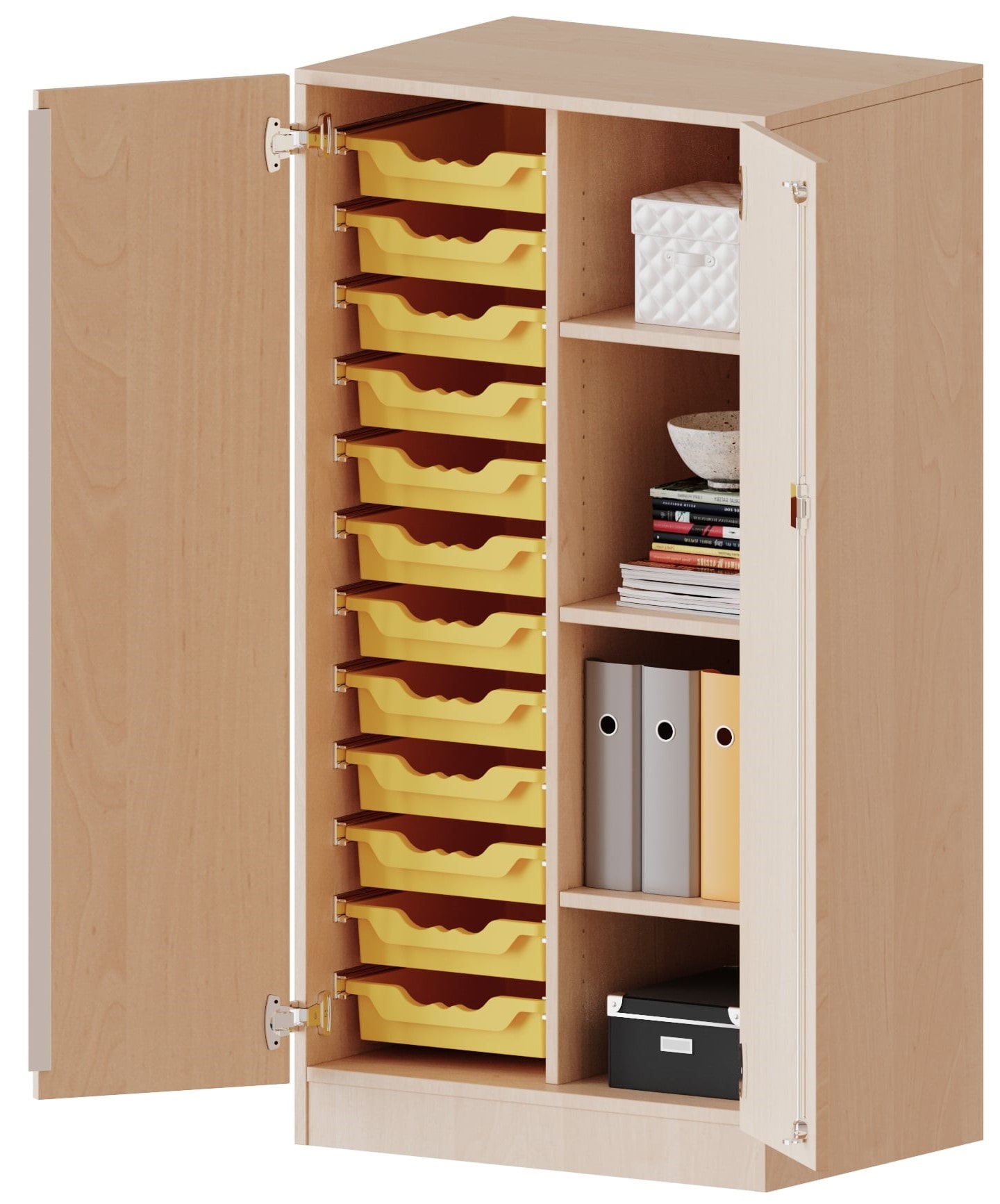 - Höhe 154 cm: unten 12 ErgoTray Boxen und oben 4 Fächer (entspricht 4 Ordnerhöhen)
