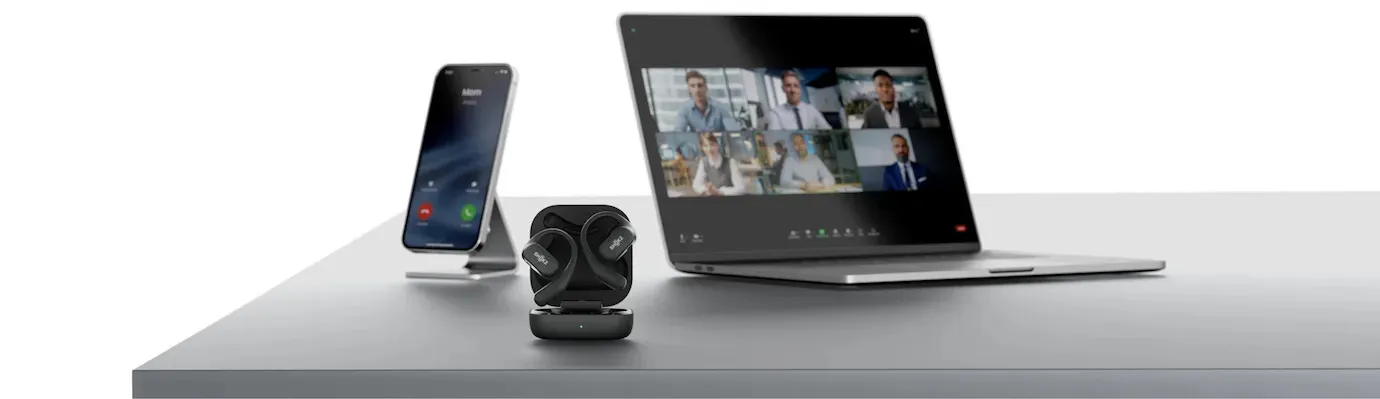 Mit MultiPoint-Pairing können Sie die OpenFit-Kopfhörer gleichzeitig mit zwei Geräten verbinden und mühelos zwischen Laptop, Tablet oder Smartphone wechseln. Die Verbindung erfolgt über Bluetooth™ 5.2, das eine stabile Reichweite von bis zu 10 Metern bietet.