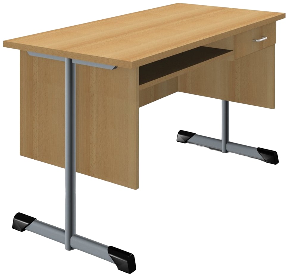Der Unterbau des Lehrerpultes besteht aus einem offenen Ablagefach auf der einen und einem Schubkasten auf Rollenführung auf der anderen Seite. Hierbei können Sie zwischen verschiedenen Griffen oder einer Variante mit Schloss wählen.