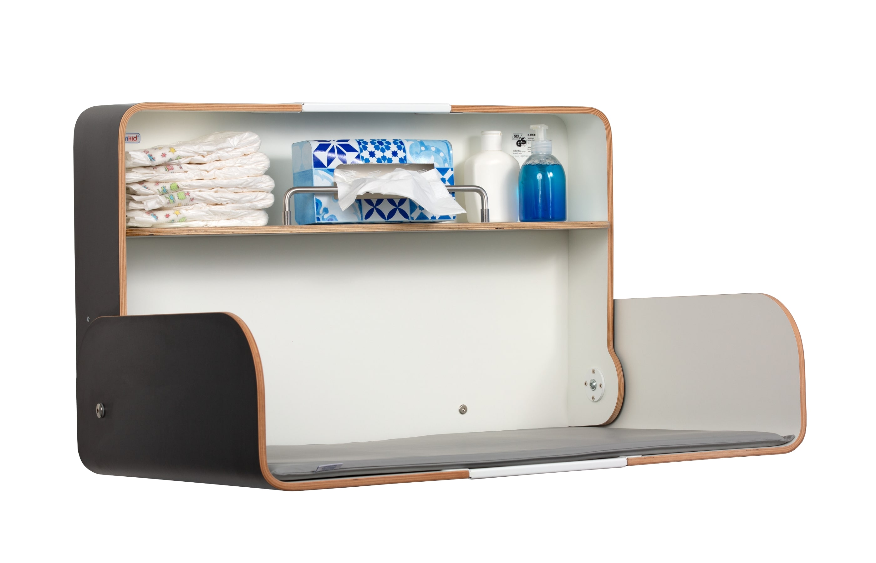 Die Wandwickeltische der Firma timkid stellen eine tolle platzsparende Alternative zu den herkömmlichen Wickelkommoden dar. Der Wickeltisch kann flexibel in jeder gewünschten Höhe angebracht werden und öffnet sich unkompliziert mit nur einem Handgriff. Hierdurch wird ein Wickeln in einer rückenschonenden und ergonomischen Position ermöglicht. Ein eingebauter Regalboden bietet den benötigten Platz für die Pflegeartikel.