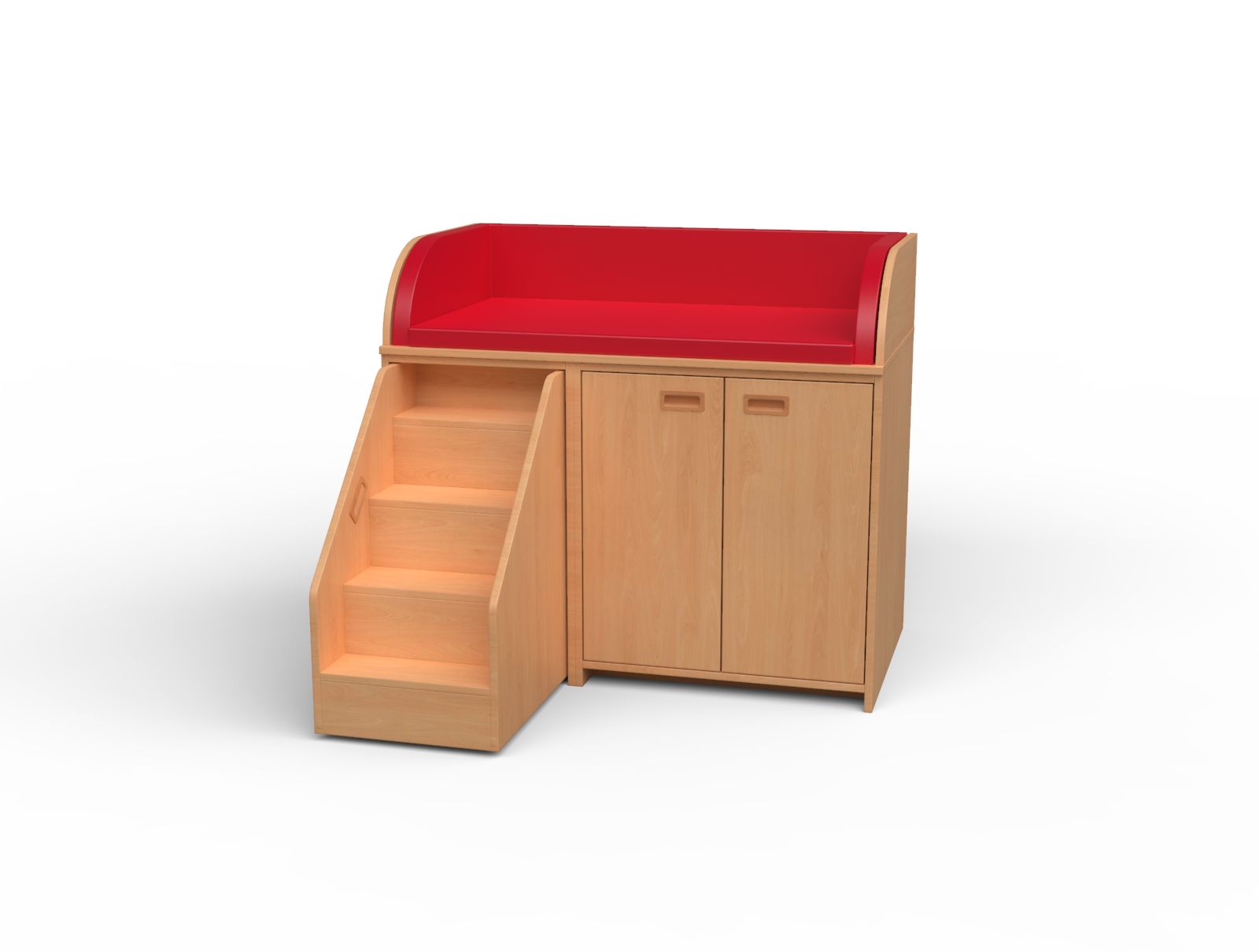 Die Wickelkommode verfügt über eine ausziehbare Treppe, die es den Kindern ermöglicht, selbstständig auf die Wickelfläche zu gelangen. Dank der Treppe werden die Erzieher entlastet, da sie die Kinder nicht mehr auf die Kommode heben müssen, was eine Schonung für den Rücken darstellt. Sie können die verriegelbare Treppe wahlweise auf der linken oder rechten Seite einbauen lassen. Optional können Sie die Treppe mit einem Handlauf (Edelstahl-Griffstange) ausstatten.